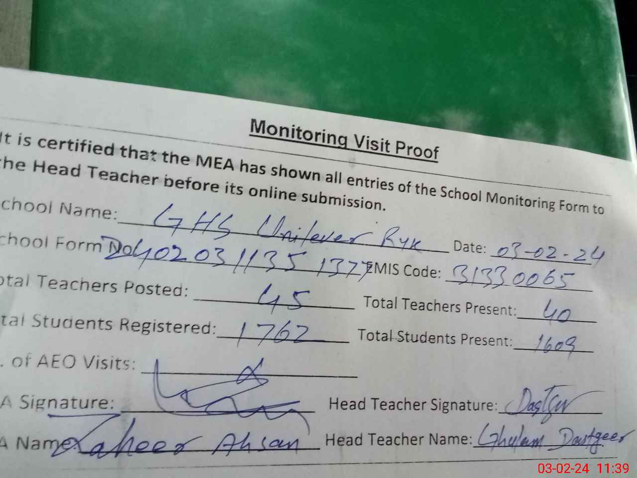 | EMIS Code: 31330065 | Name of School: GHS UNILEVER R.Y.KHAN | |||