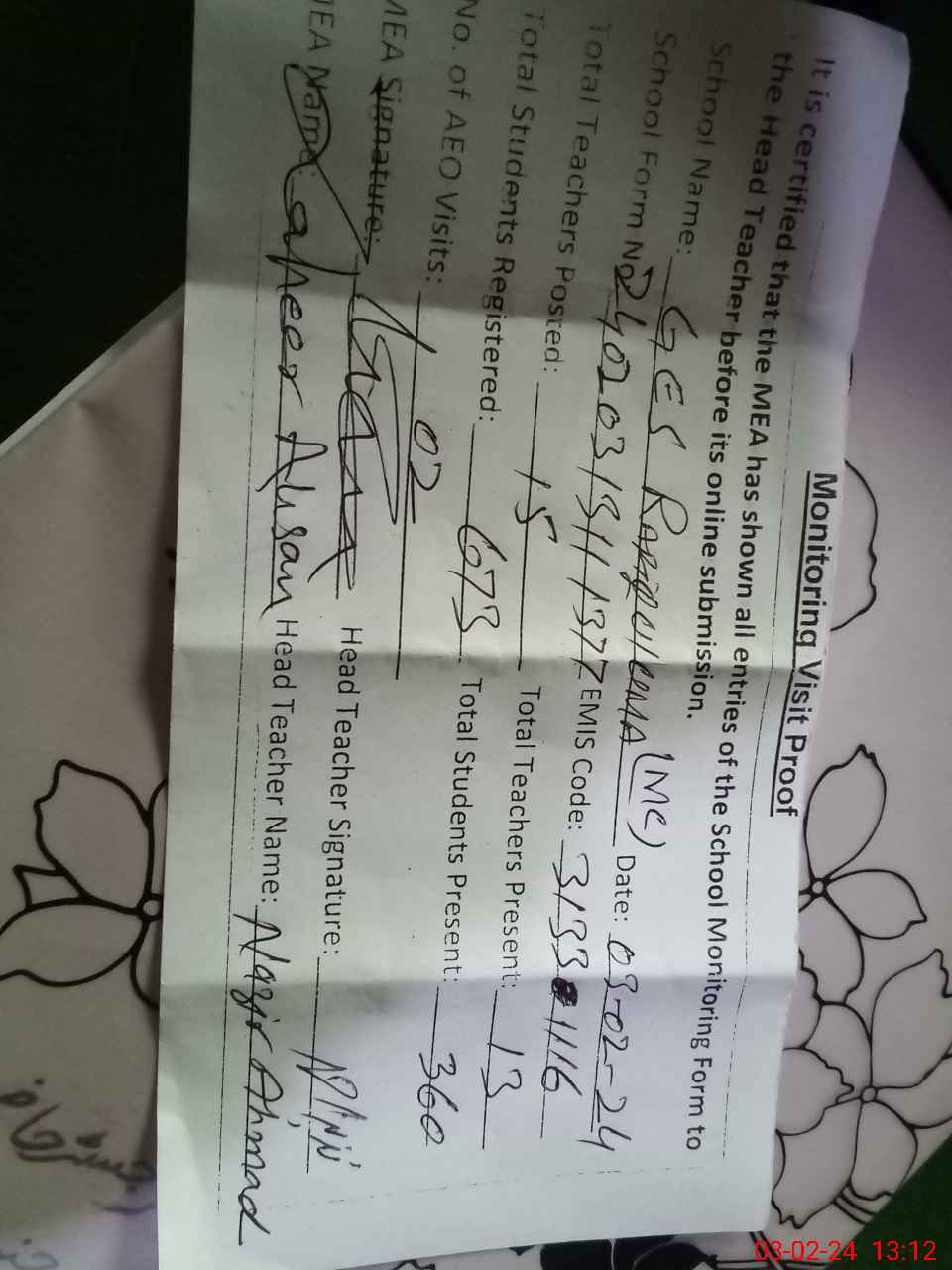 | EMIS Code: 31331116 | Name of School: GES MC RAFIQ-UL-ULMA | |||