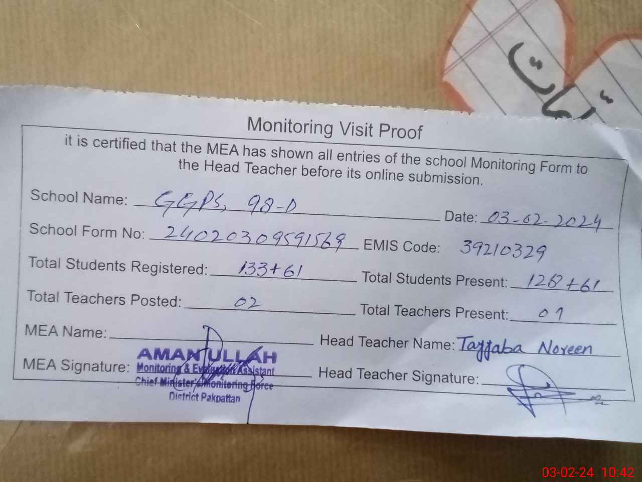 | Attendance Register | Head Teacher | MEA with School | Visit Proof |