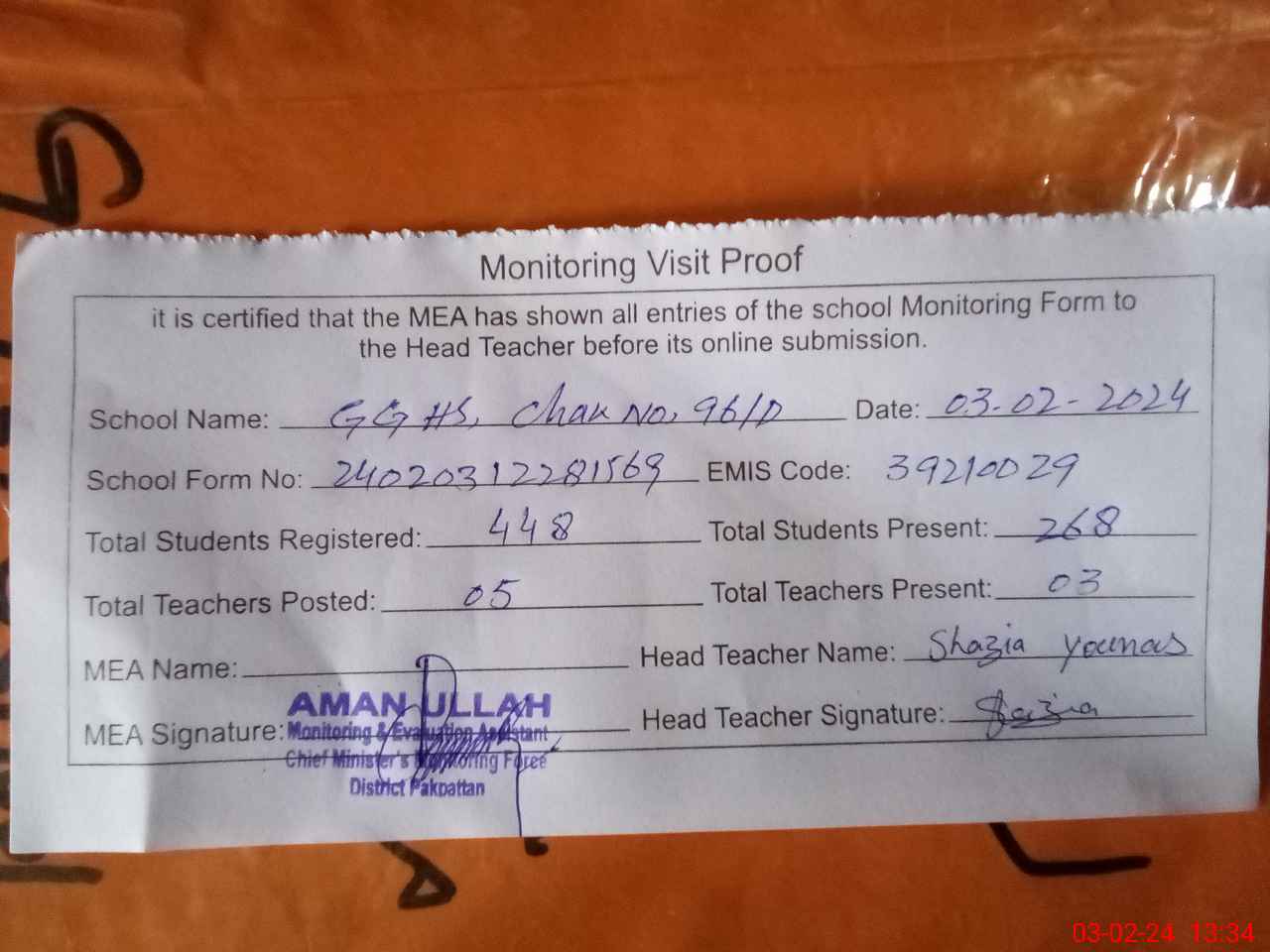 | Attendance Register | Head Teacher | MEA with School | Visit Proof |