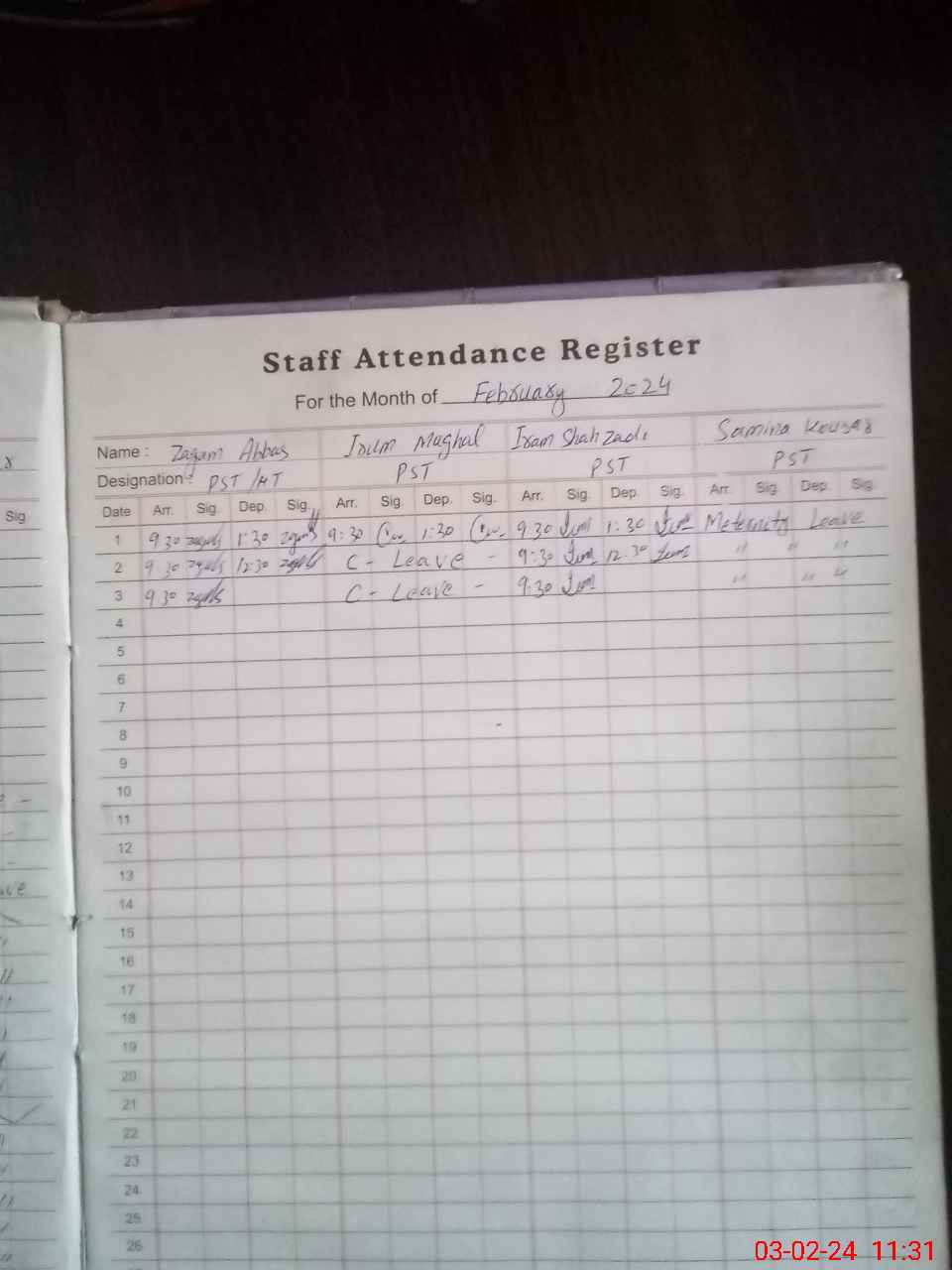| Leave | Duty | Absent | Maternity | Medical | Ex- Pak |