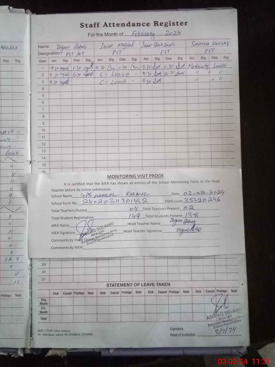 | Attendance Register | Head Teacher | MEA with School | Visit Proof |