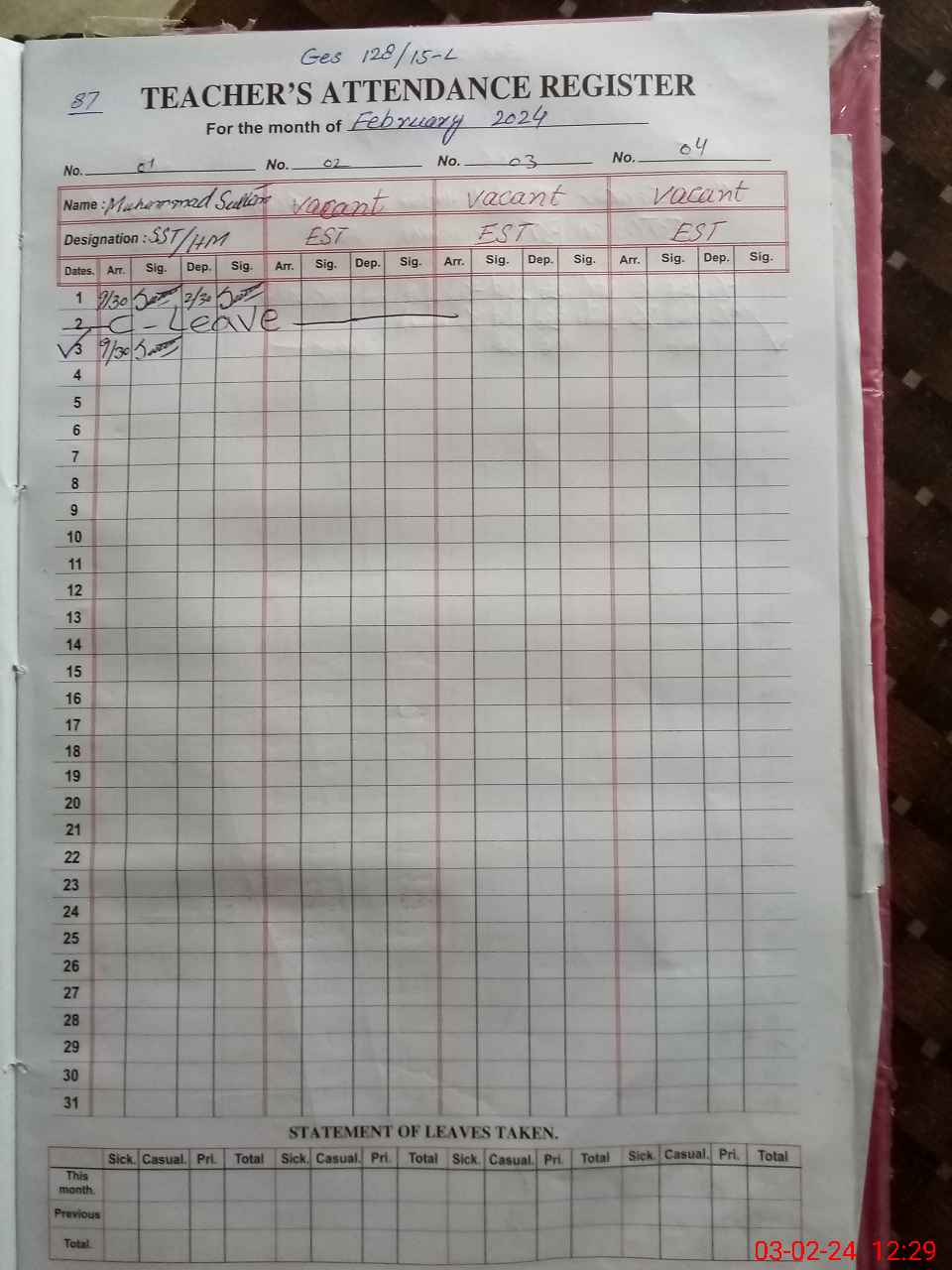 | Remarks (Use Separate Page if Required): NO AEO VISIT IN THE MONTH OF JANUARY 2024 NAZIR AHMAD EST GENERAL HAS BEEN EXPIRED ON 06 MAY 2023 BUT HIS NAME IS STILL EXIST IN PMIU LIST MEA TAB LIST NSB GRANTS AND FTF RECORDS ARE NOT MAINTAINED NSB GRANTS BANK STATEMENTS UPTO 17 SEPTEMBER 2023 ARE AVAILABLE AFTER THIS NO STATEMENTS ARE AVAILABLE FTF BANK STATEMENTS ARE NOT AVAILABLE LESSON PLANS ARE NOT AVAILABLE RANDOM CLASS SIX IS NOW IN CLASS EIGHT | |||||