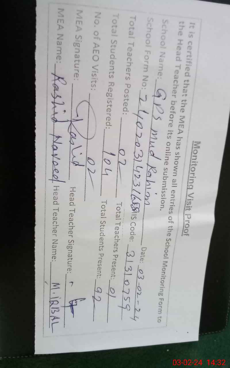 | EMIS Code: 31310759 | Name of School: GPS MUD RAHIM | |||