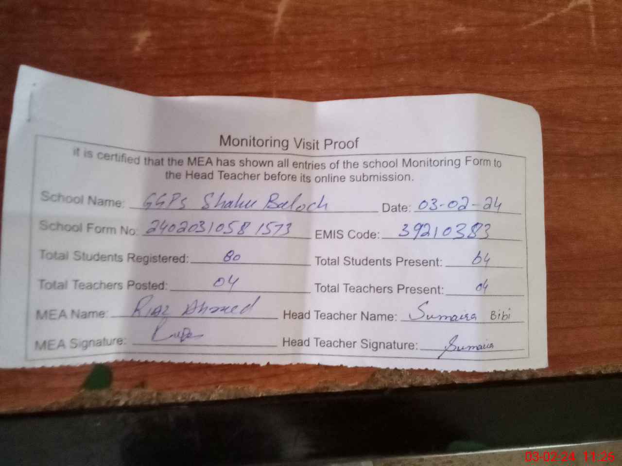 | Attendance Register | Head Teacher | MEA with School | Visit Proof |