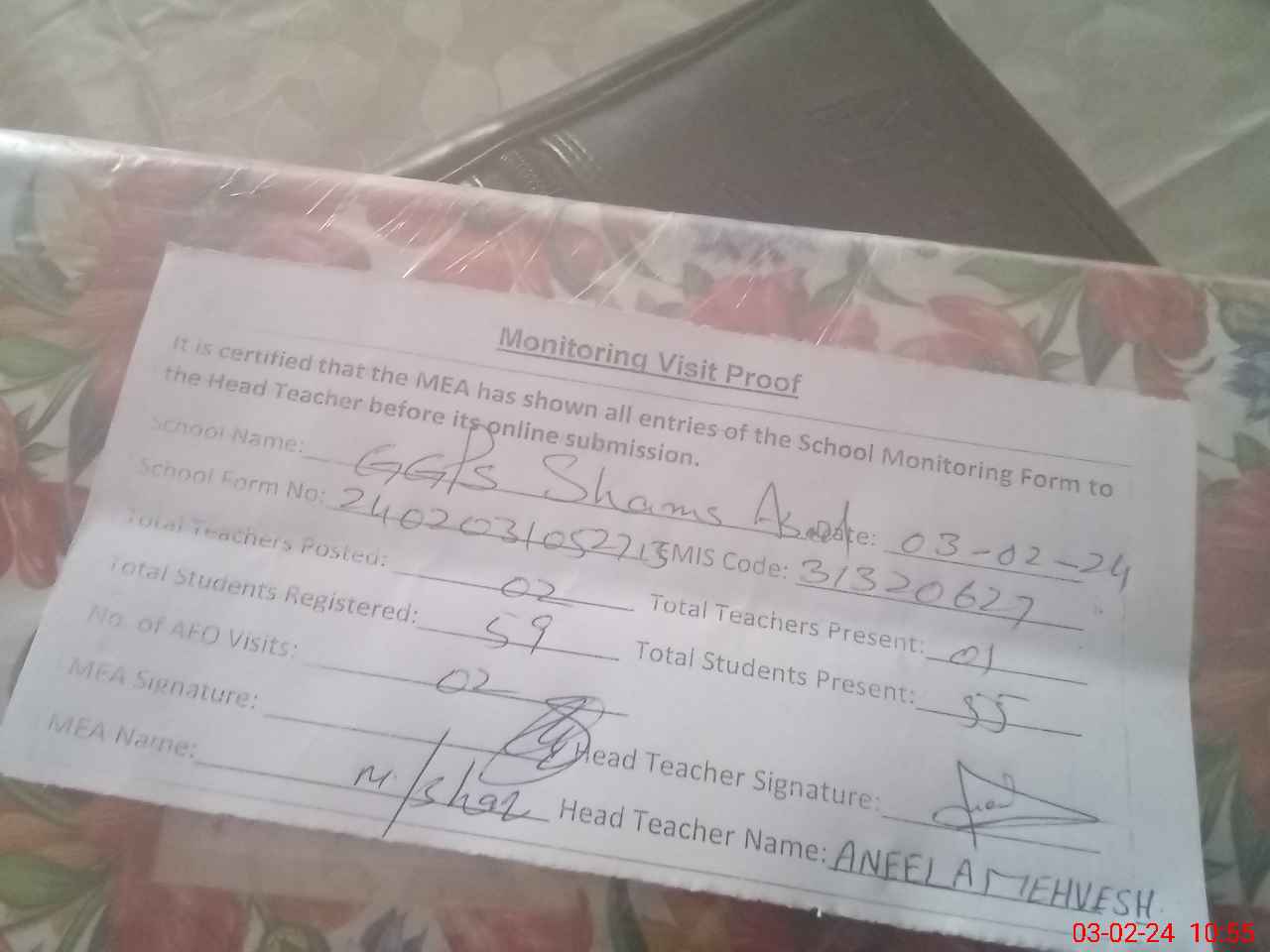 | Attendance Register | Head Teacher | MEA with School | Visit Proof |