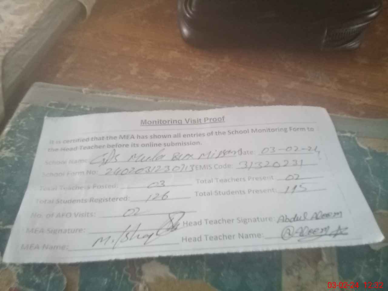 | Attendance Register | Head Teacher | MEA with School | Visit Proof |