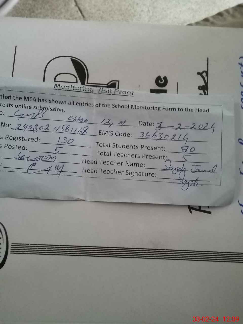 | Attendance Register | Head Teacher | MEA with School | Visit Proof |