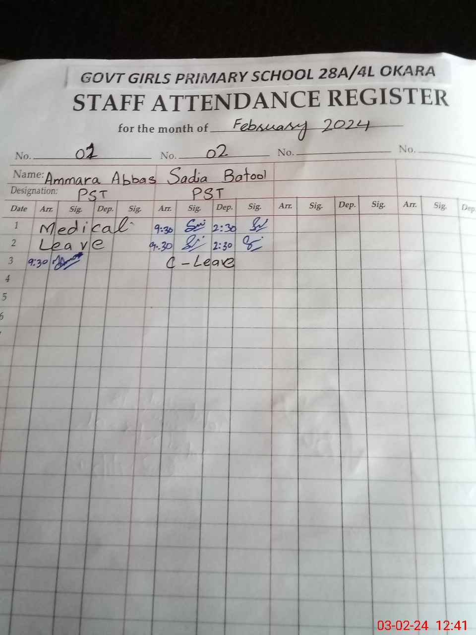 | Leave | Duty | Absent | Maternity | Medical | Ex- Pak |