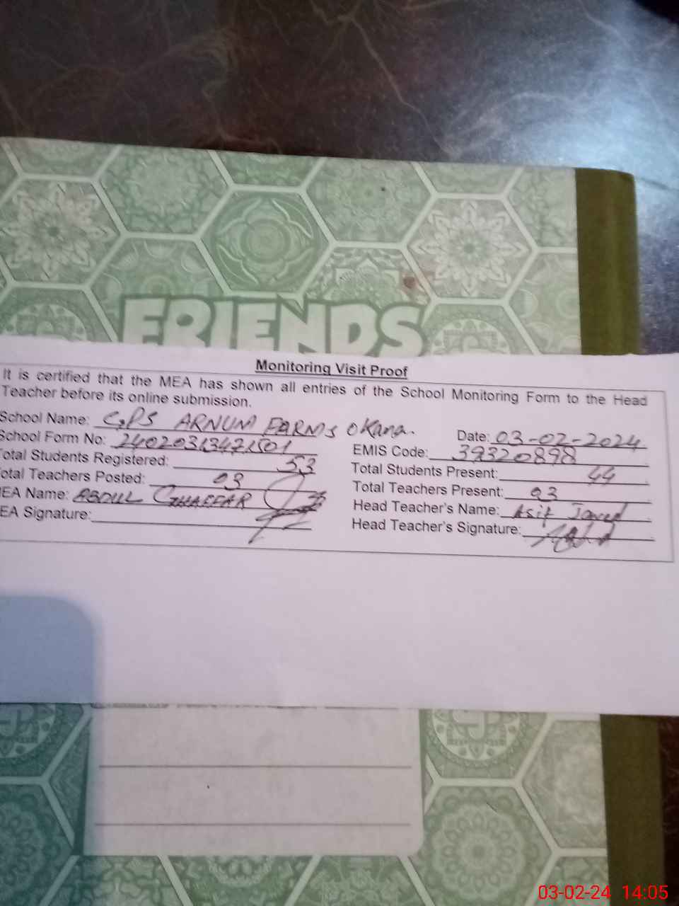 | Attendance Register | Head Teacher | MEA with School | Visit Proof |