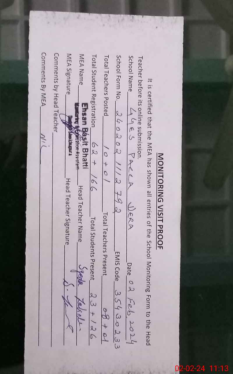 | Certified that this School was Inspected by the Undersigned MEA/DMO Today and the Information Stated Above is as Per Record. | |||||