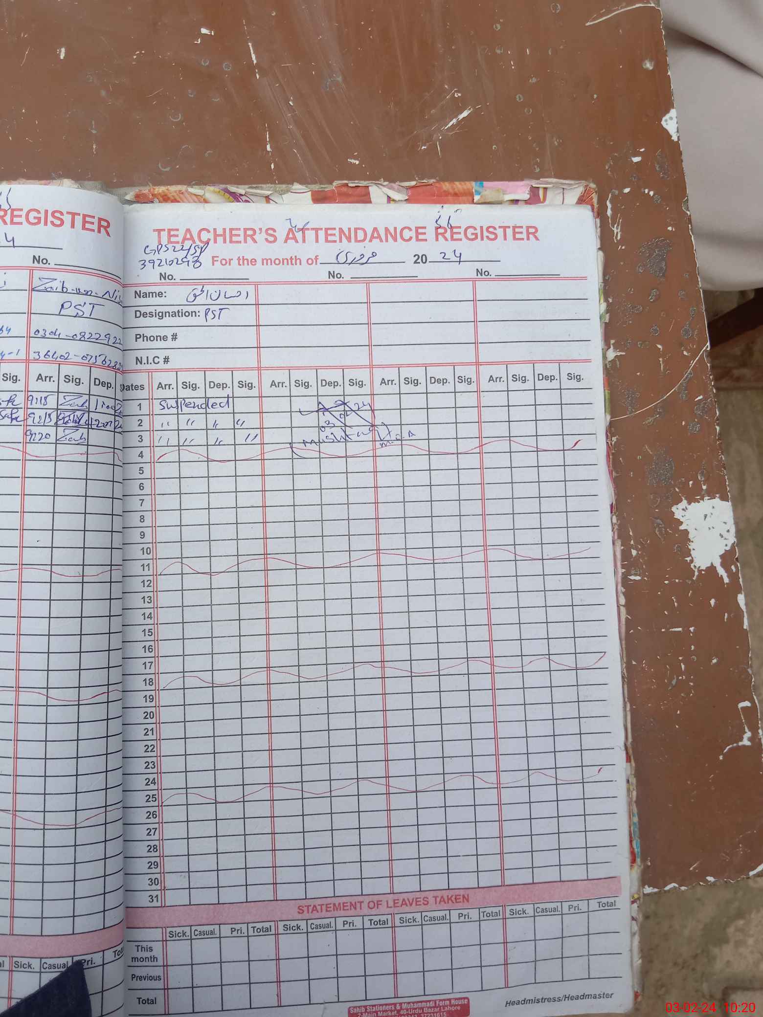 | CNIC | Full Name | Designation | R/C | Absence During Last Calender Month |