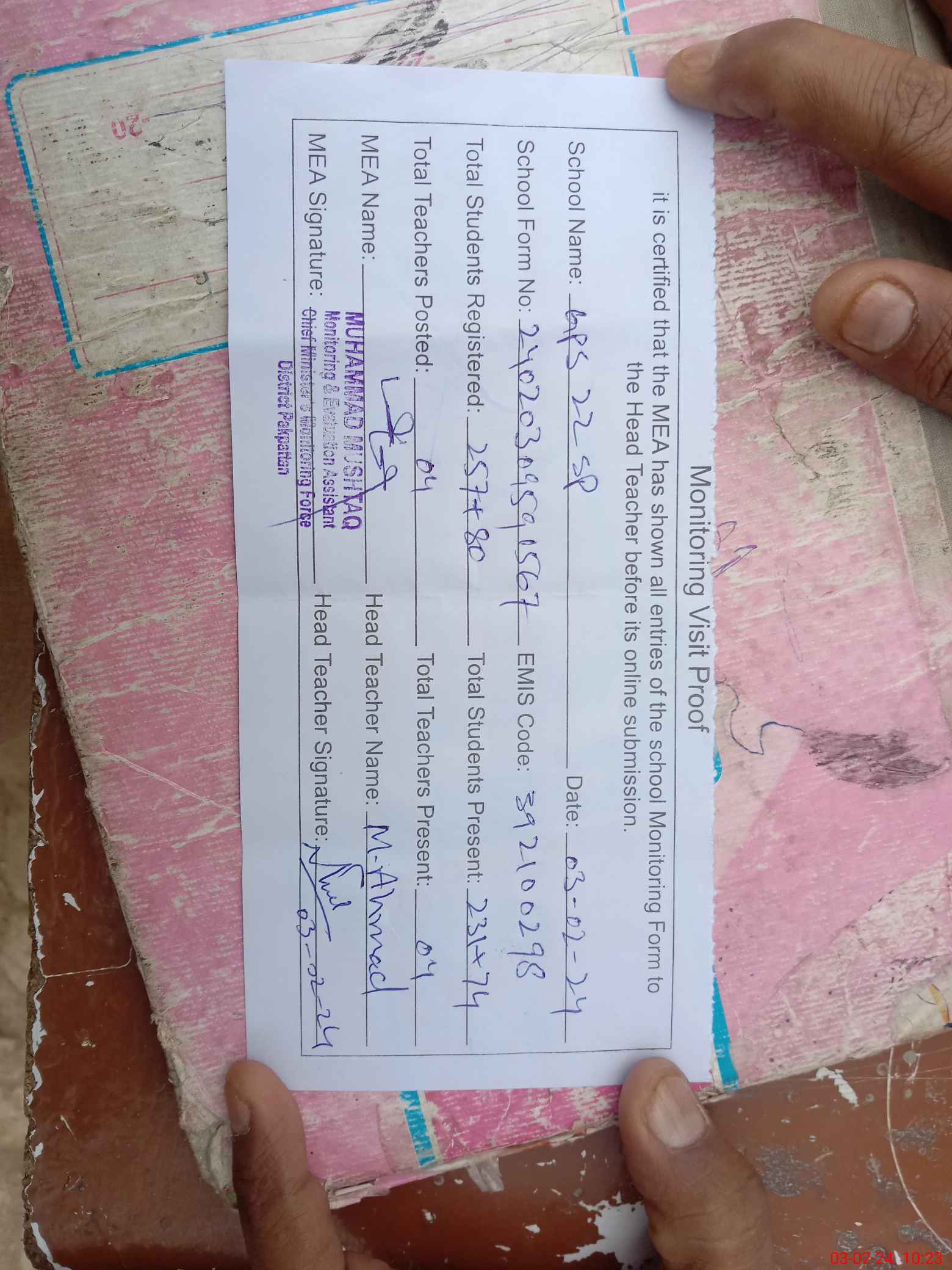 | Attendance Register | Head Teacher | MEA with School | Visit Proof |
