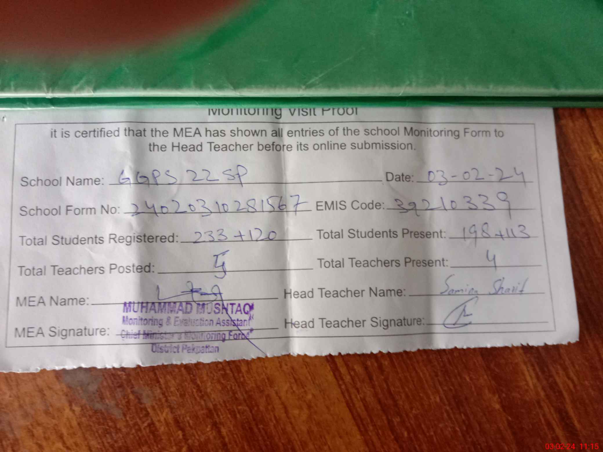 | Attendance Register | Head Teacher | MEA with School | Visit Proof |