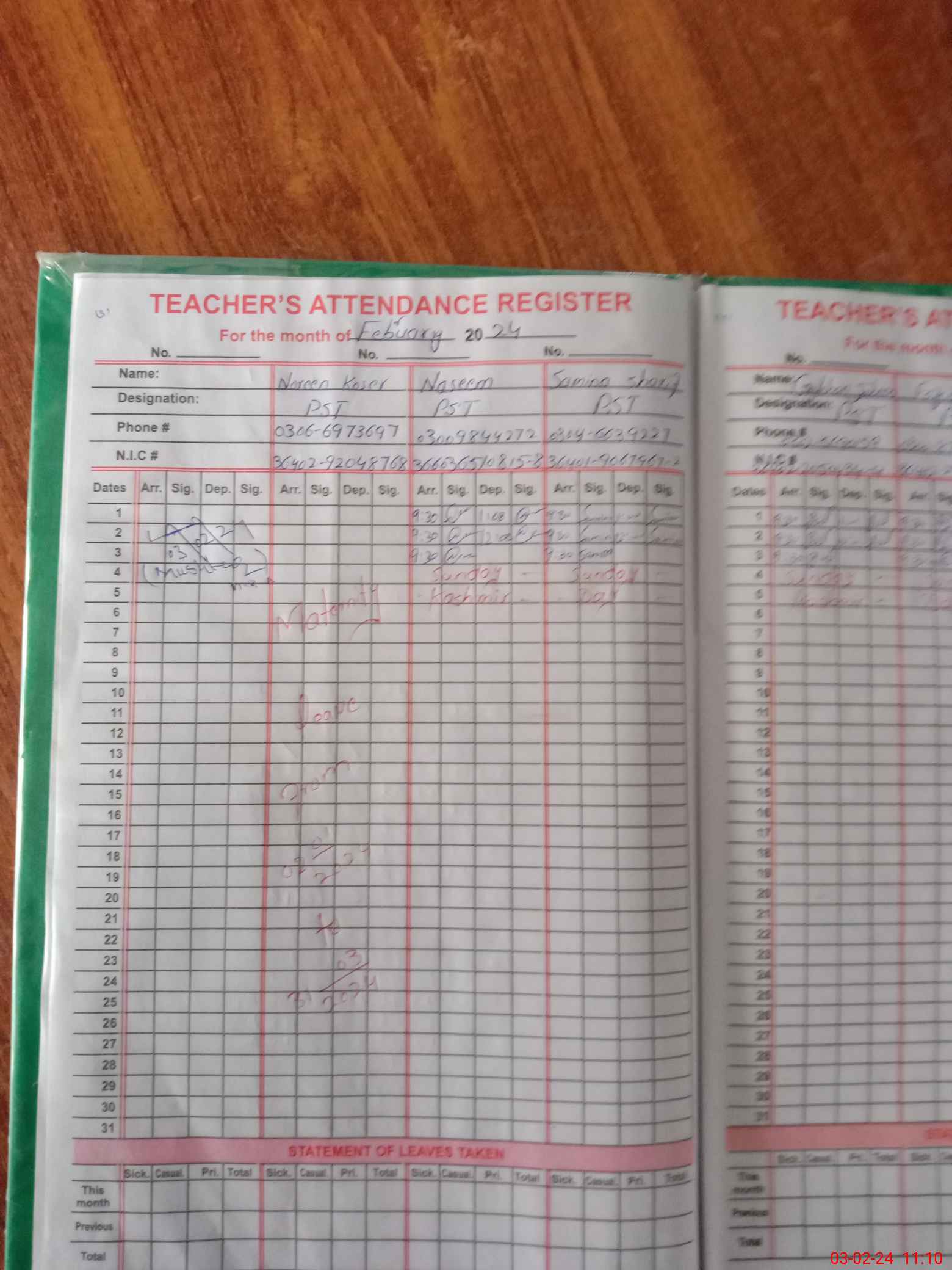 | CNIC | Full Name | Designation | R/C | Absence During Last Calender Month |