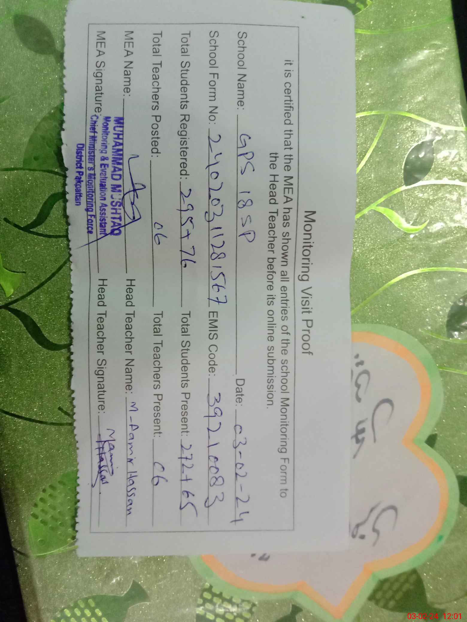 | Attendance Register | Head Teacher | MEA with School | Visit Proof |