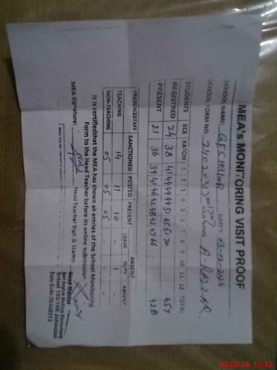| Attendance Register | Head Teacher | MEA with School | Visit Proof |