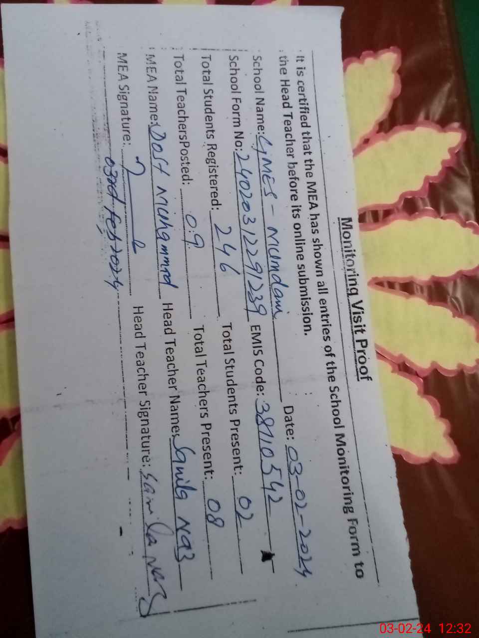 | Attendance Register | Head Teacher | MEA with School | Visit Proof |