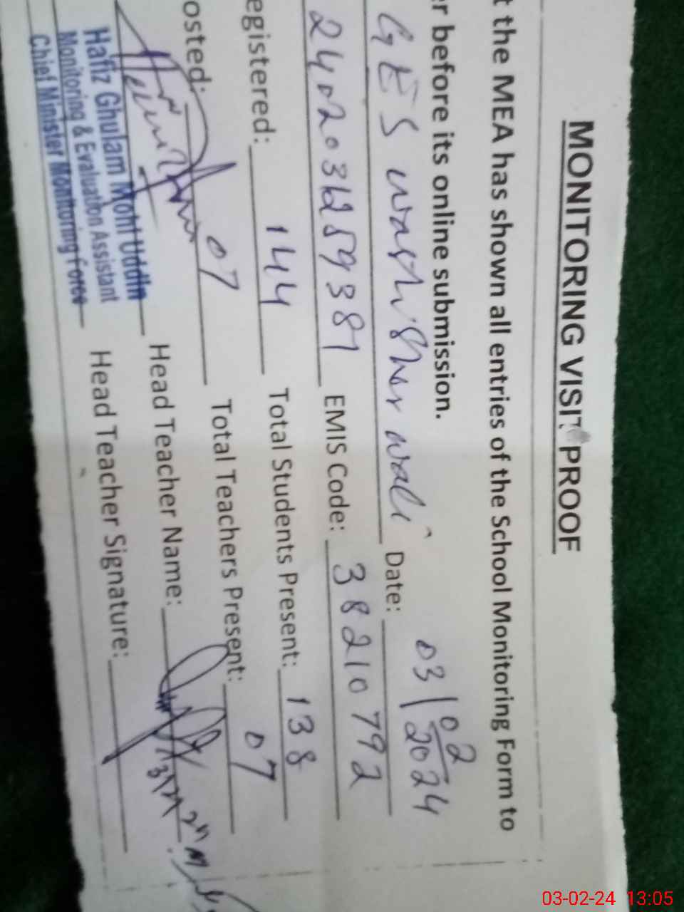 | Attendance Register | Head Teacher | MEA with School | Visit Proof |