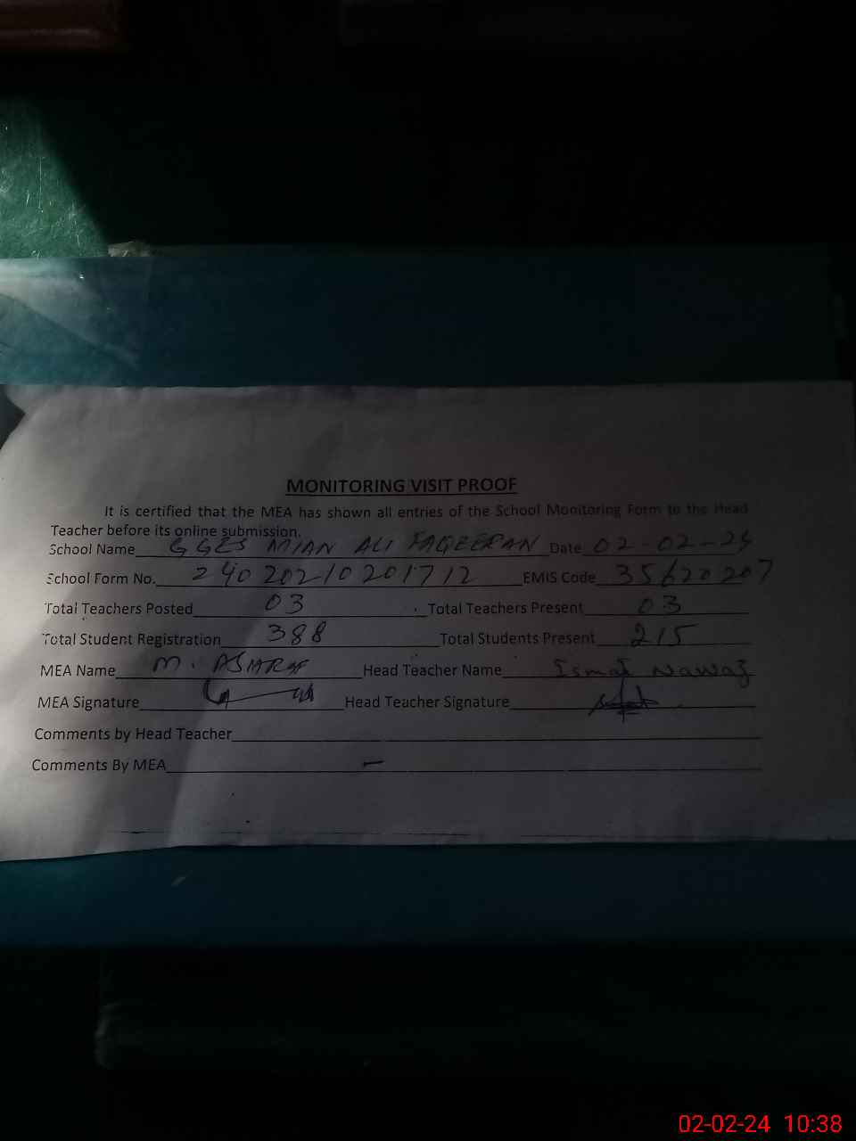 | Certified that this School was Inspected by the Undersigned MEA/DMO Today and the Information Stated Above is as Per Record. | |||||