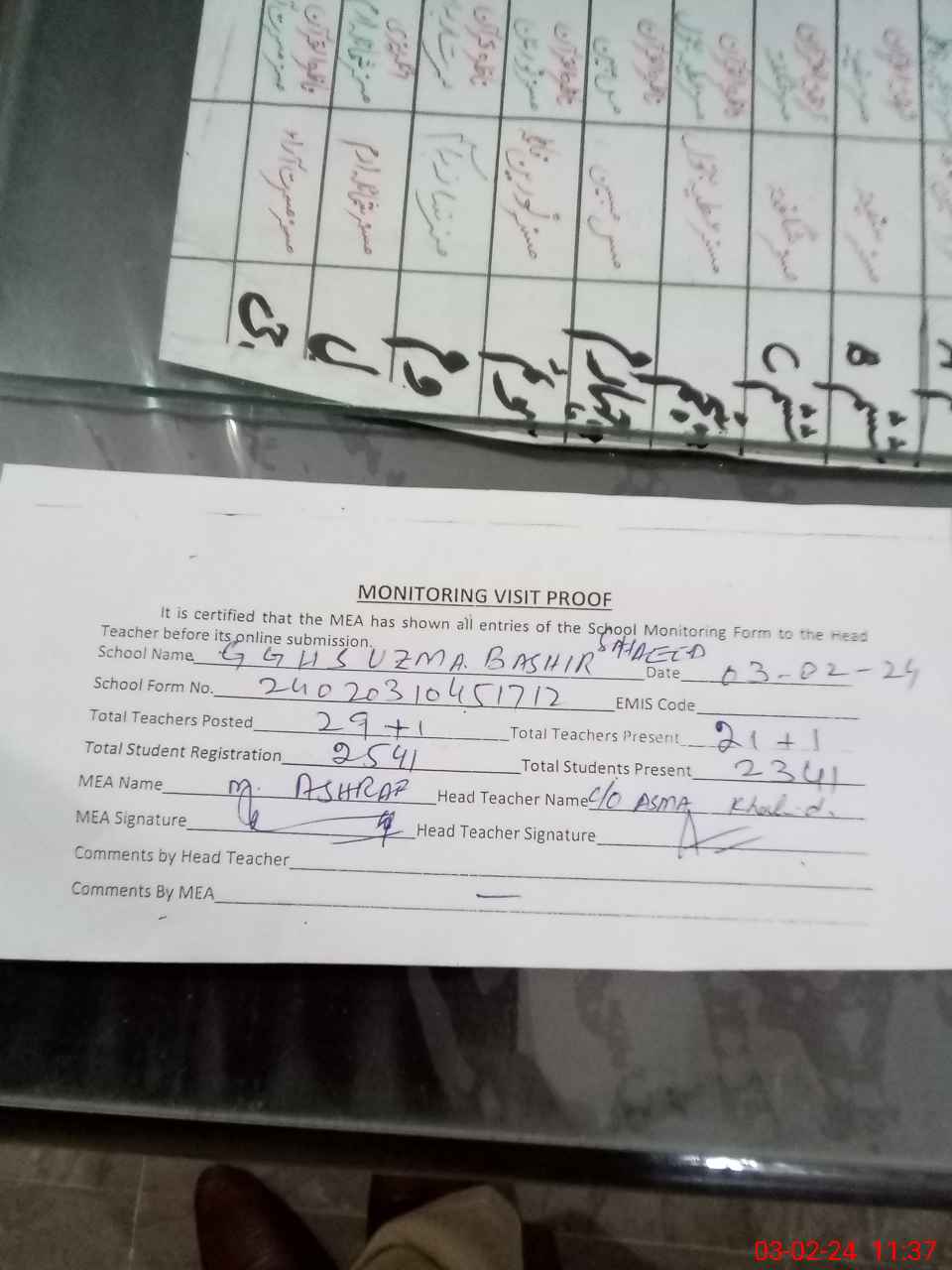 | Attendance Register | Head Teacher | MEA with School | Visit Proof |