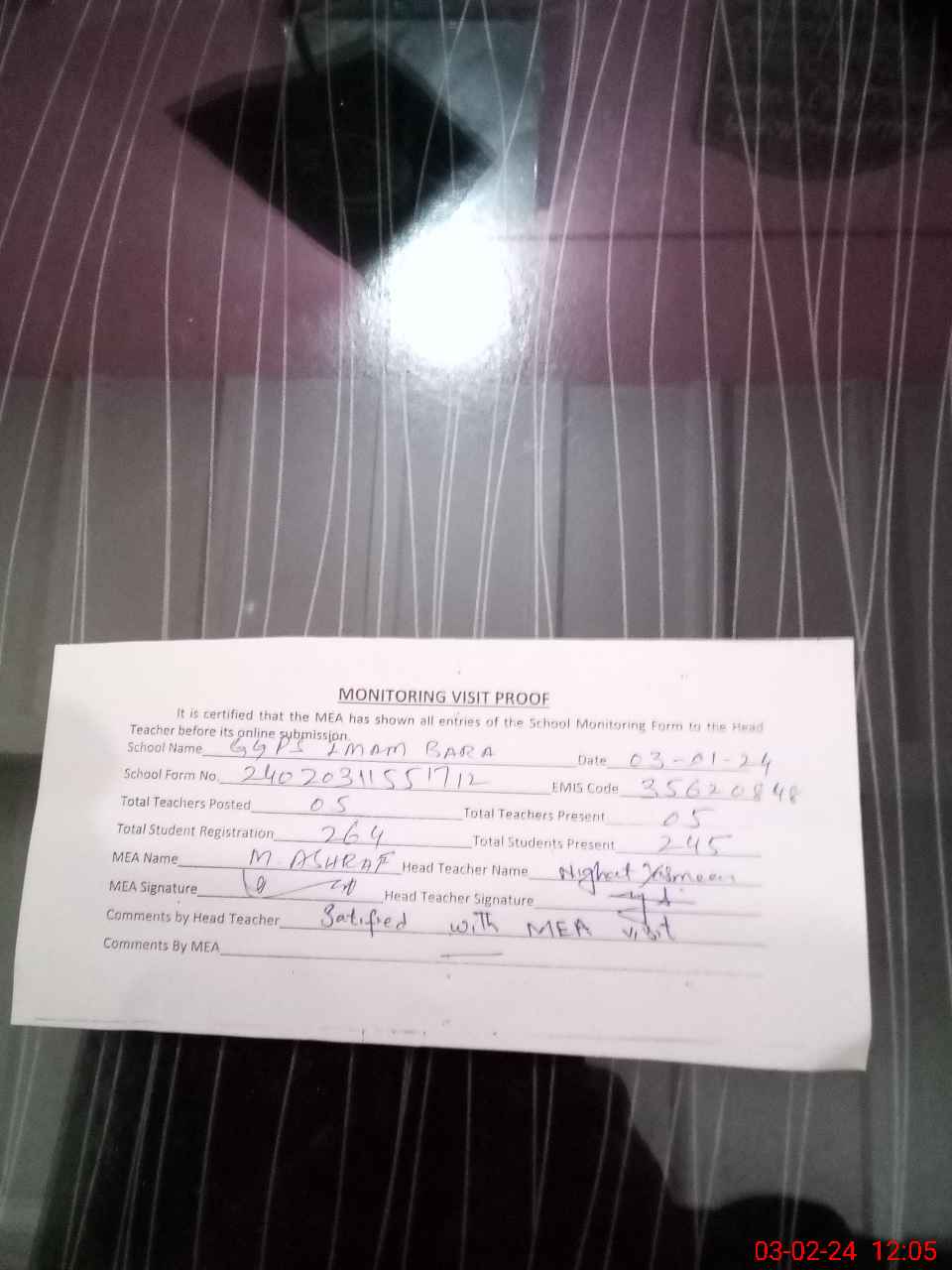 | Attendance Register | Head Teacher | MEA with School | Visit Proof |