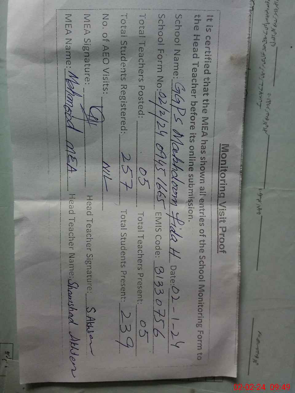 | Monitoring Date: 02-02-2024 | Start Time: 02-02-2024 09:21 AM | End Time: 02-02-2024 09:49 AM | Name of MEA: Ma**** UlHa**** | |