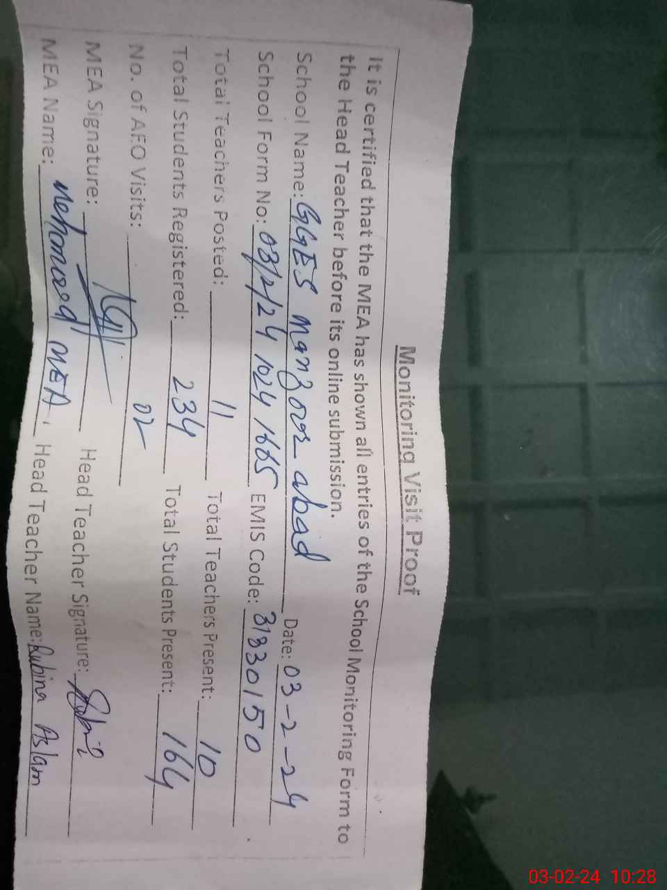 | Monitoring Date: 03-02-2024 | Start Time: 03-02-2024 10:06 AM | End Time: 03-02-2024 10:28 AM | Name of MEA: Ma**** UlHa**** | |