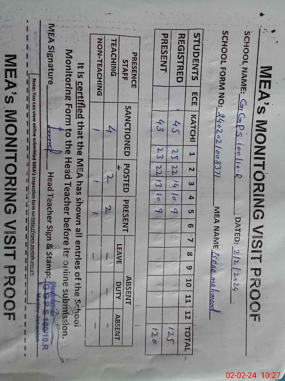 | Attendance Register | Head Teacher | MEA with School | Visit Proof |