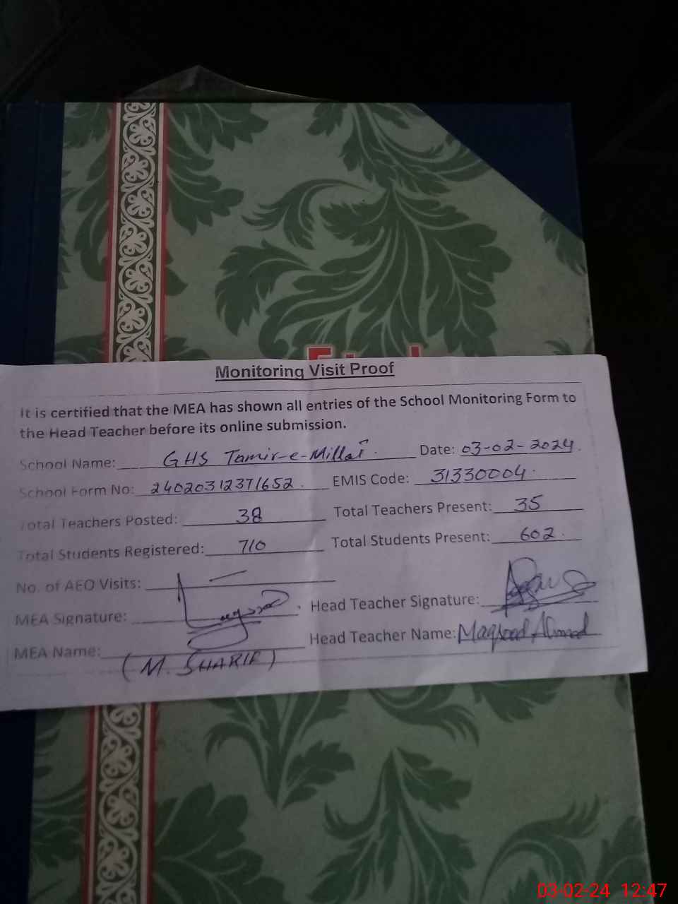 | Certified that this School was Inspected by the Undersigned MEA/DMO Today and the Information Stated Above is as Per Record. | |||||