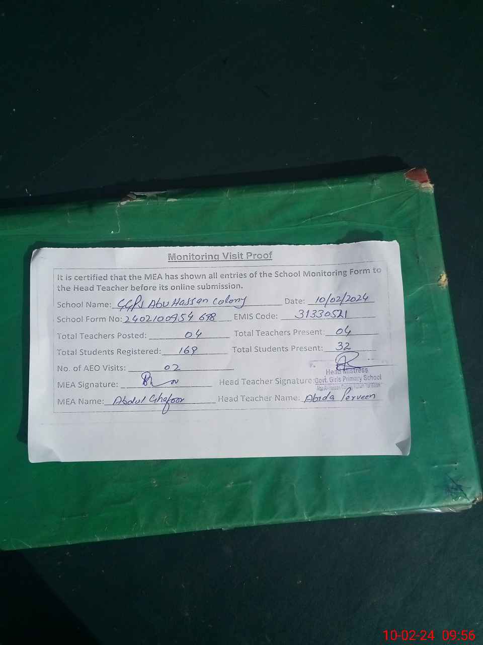 | EMIS Code: 31330521 | Name of School: GGPS ABUL HASSAN COLONY | |||