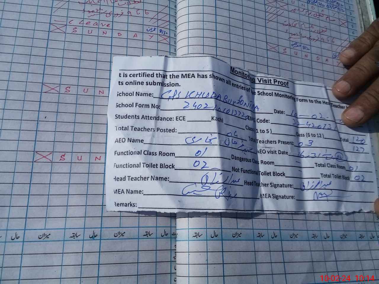 | Attendance Register | Head Teacher | MEA with School | Visit Proof |