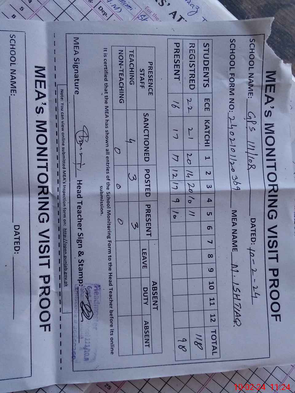 | Attendance Register | Head Teacher | MEA with School | Visit Proof |