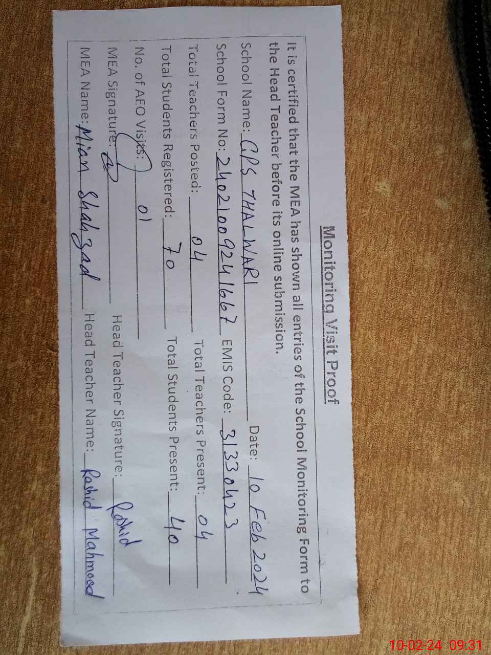 | EMIS Code: 31330423 | Name of School: GPS THALWARI | |||