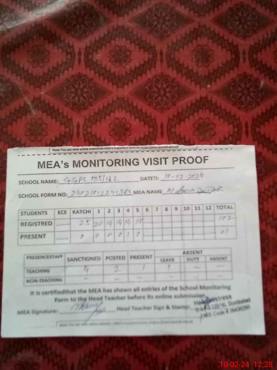 | Attendance Register | Head Teacher | MEA with School | Visit Proof |
