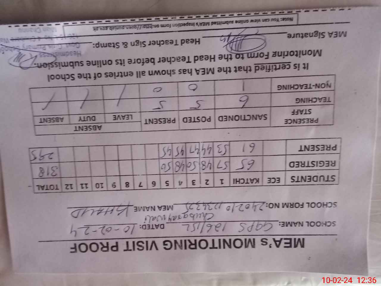 | Attendance Register | Head Teacher | MEA with School | Visit Proof |