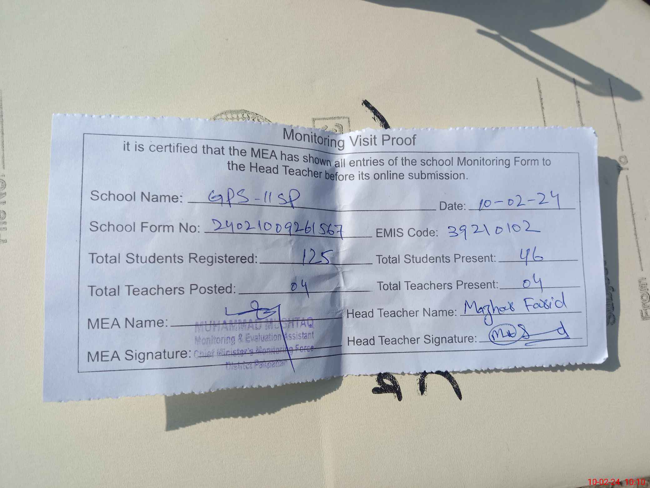 | EMIS Code: 39210102 | Name of School: GPS 11/SP P.O 8/S.P PAKPATTAN | |||