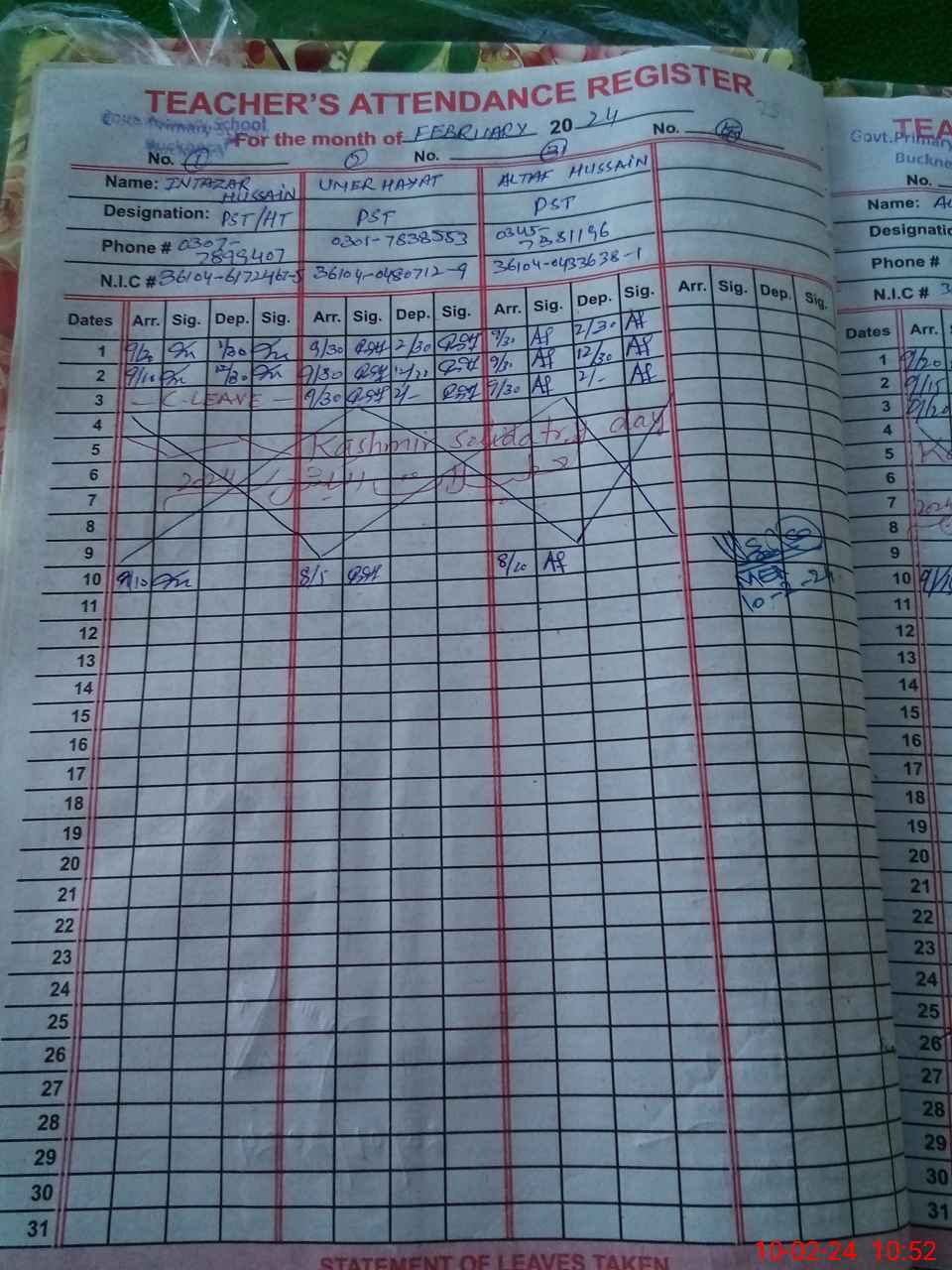 | CNIC | Full Name | Designation | R/C | Absence During Last Calender Month |