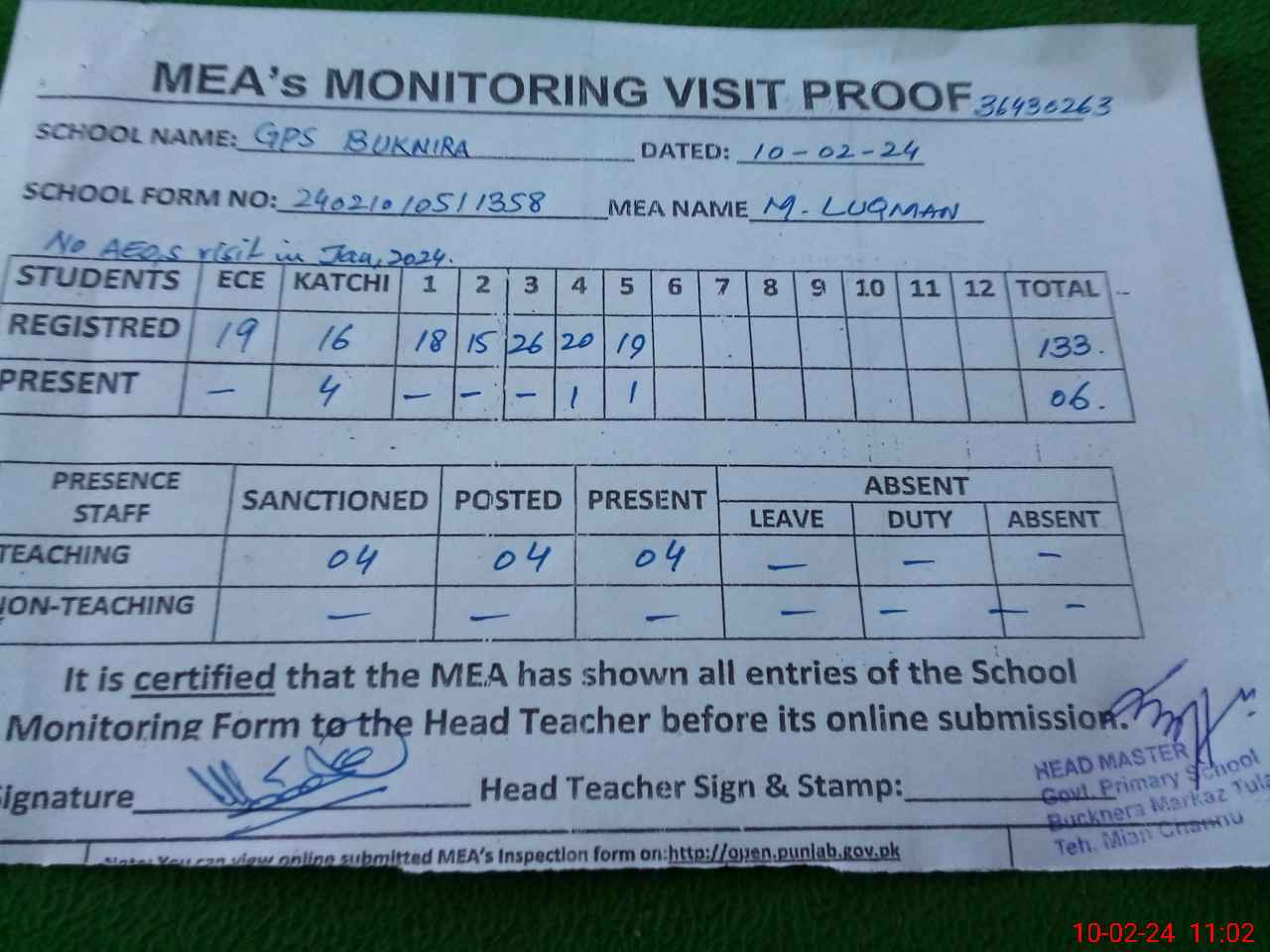 | Attendance Register | Head Teacher | MEA with School | Visit Proof |