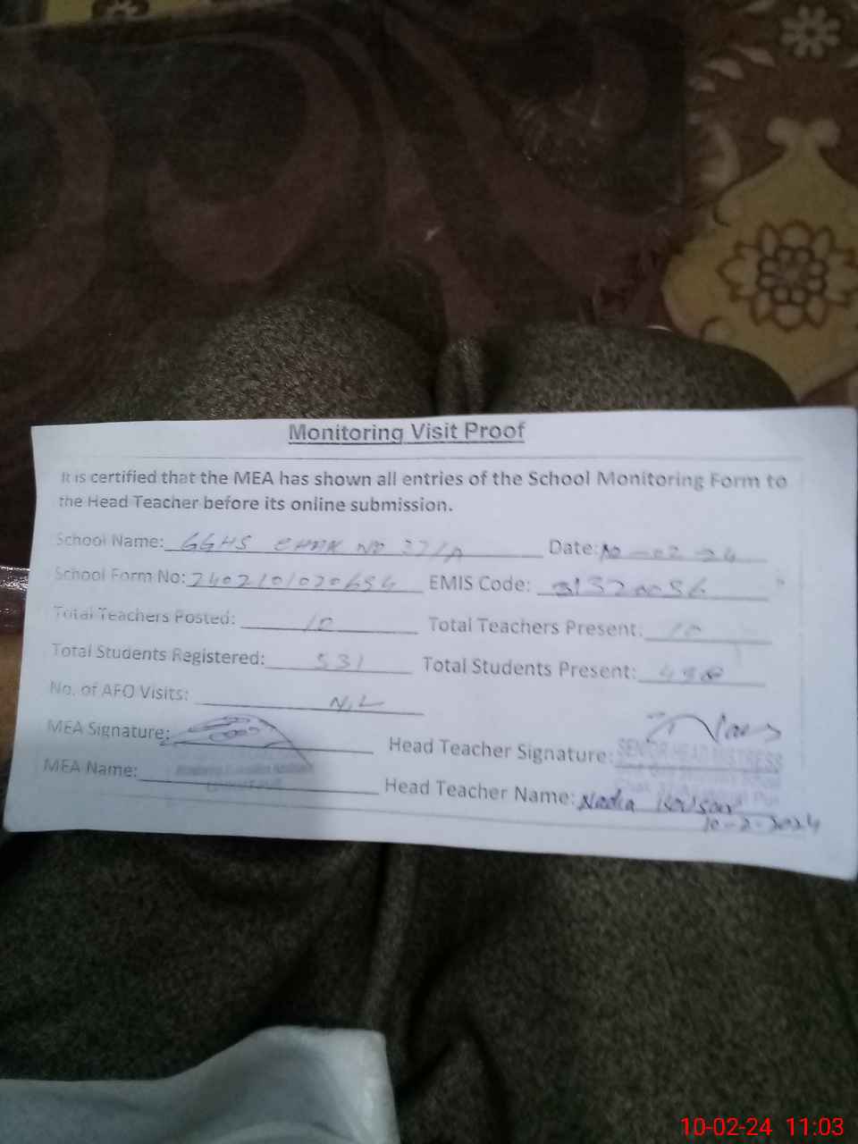 | Monitoring Date: 10-02-2024 | Start Time: 10-02-2024 10:20 AM | End Time: 10-02-2024 11:03 AM | Name of MEA: Mu**** Sa**** Ul**** Sa**** | |