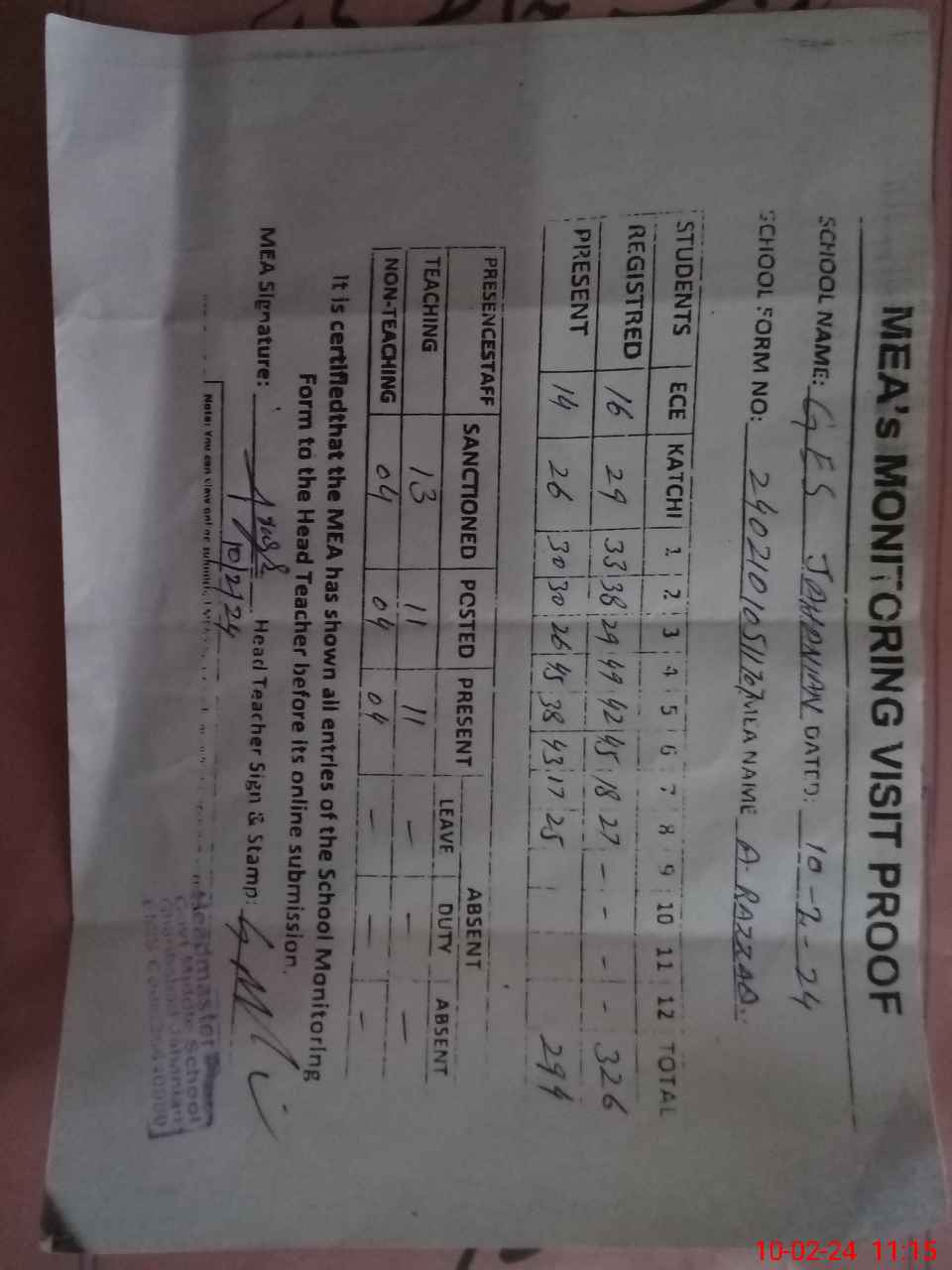 | Attendance Register | Head Teacher | MEA with School | Visit Proof |