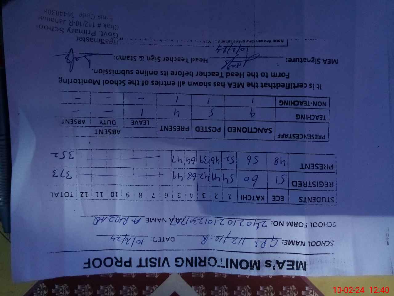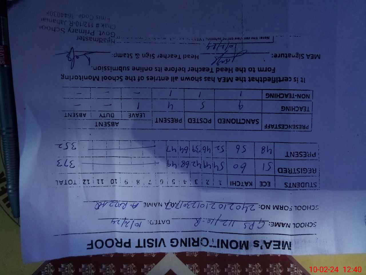 | Attendance Register | Head Teacher | MEA with School | Visit Proof |