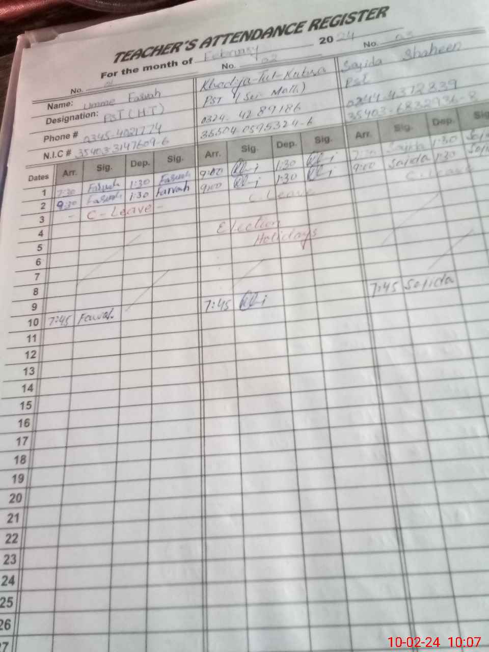| CNIC | Full Name | Designation | R/C | Absence During Last Calender Month |