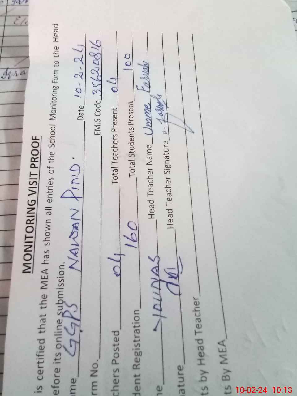 | Attendance Register | Head Teacher | MEA with School | Visit Proof |