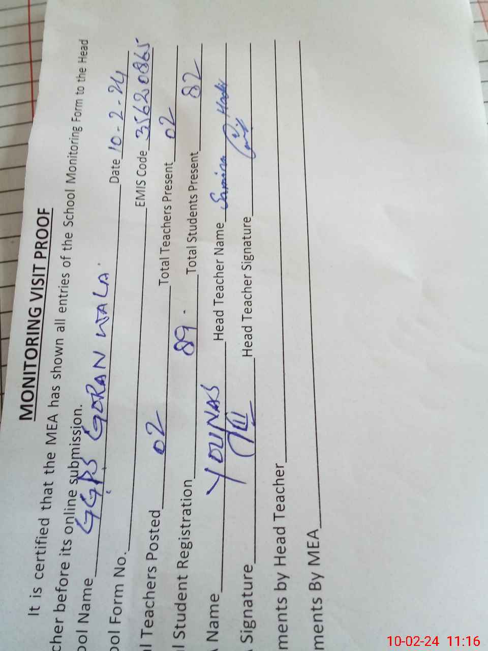 | Certified that this School was Inspected by the Undersigned MEA/DMO Today and the Information Stated Above is as Per Record. | |||||
