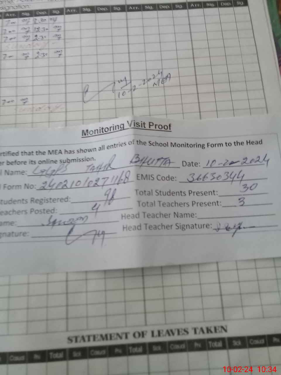 | Attendance Register | Head Teacher | MEA with School | Visit Proof |