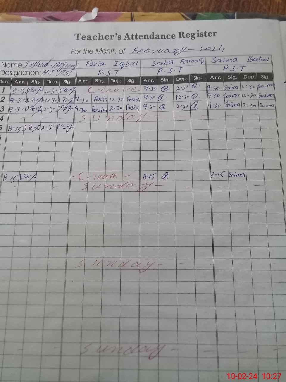 | CNIC | Full Name | Designation | R/C | Absence During Last Calender Month |