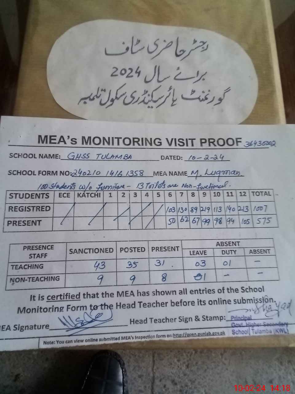 | Certified that this School was Inspected by the Undersigned MEA/DMO Today and the Information Stated Above is as Per Record. | |||||