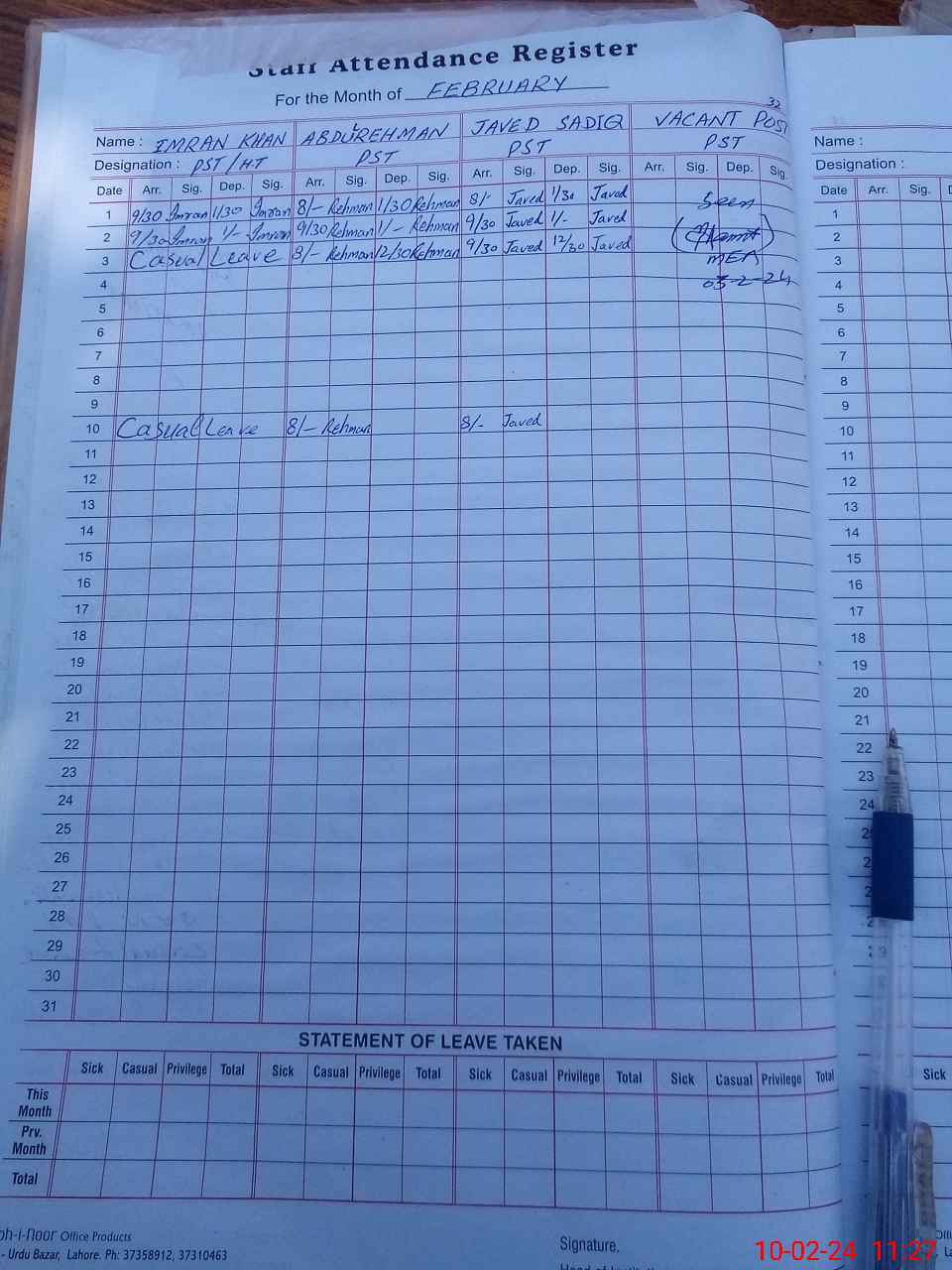 | Leave | Duty | Absent | Maternity | Medical | Ex- Pak |