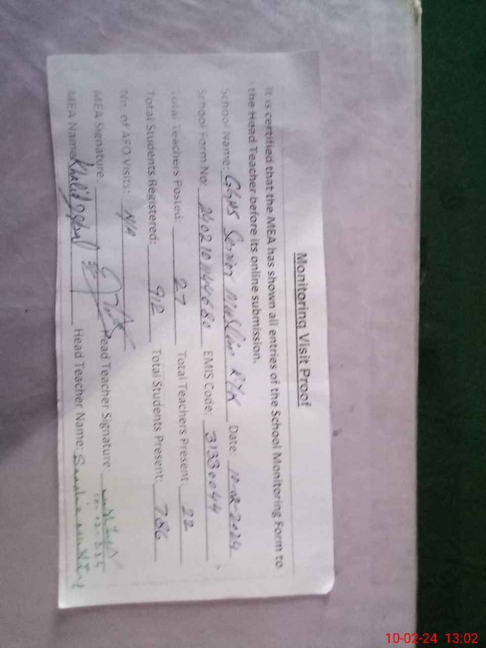 | Attendance Register | Head Teacher | MEA with School | Visit Proof |
